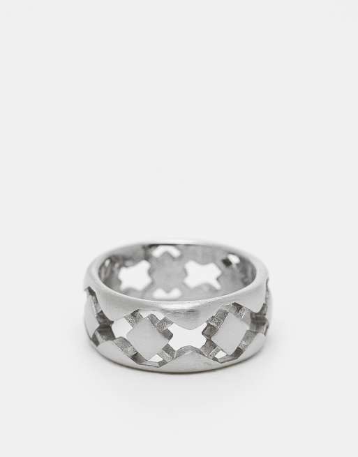 ASOS DESIGN waterproof stainless steel cut out pattern band ring in brushed silver