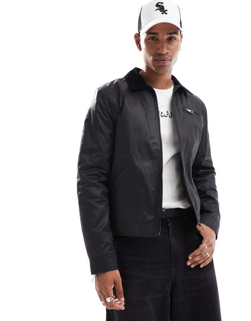ASOS DESIGN waxed worker jacket with contrast cord collar in black