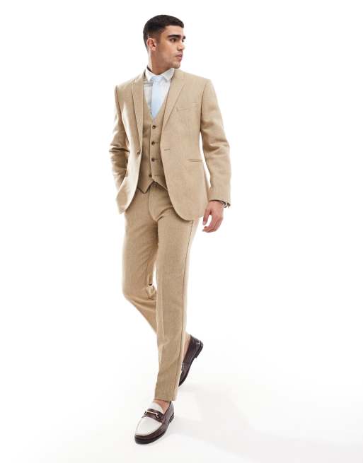 ASOS DESIGN wedding slim wool mix suit trouser in beige basketweave texture