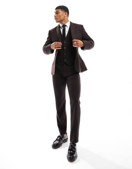 ASOS DESIGN wedding slim wool mix suit trouser in dark brown basketweave texture