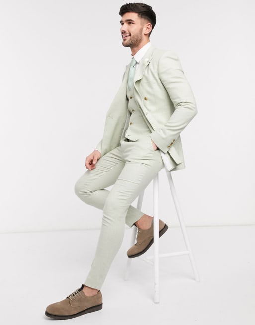 ASOS DESIGN wedding super skinny double breasted suit in cotton linen in mint