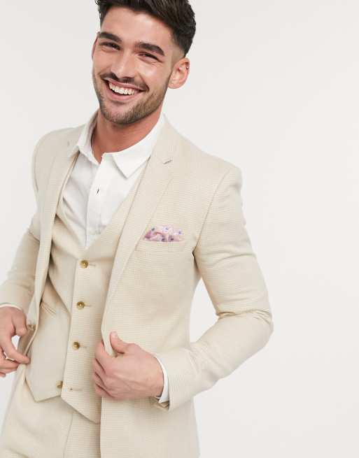 ASOS DESIGN wedding super skinny suit jacket in stretch linen mix in stone houndstooth