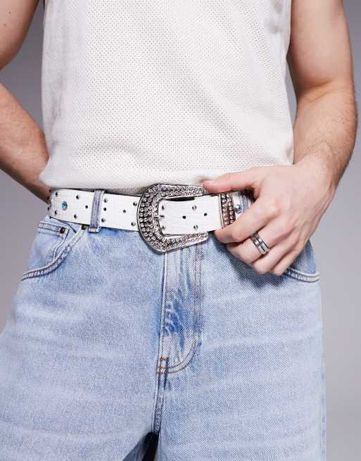 ASOS DESIGN western cowboy belt with crystal studs in white croc faux leather