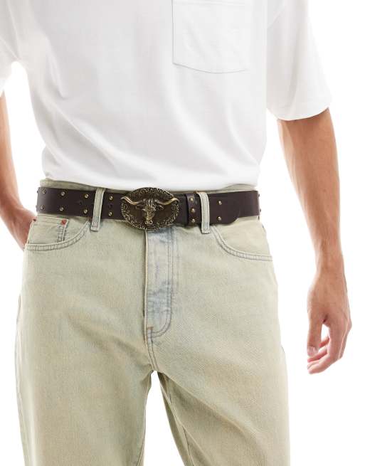 ASOS DESIGN western plated bull buckle studded belt in brown faux leather