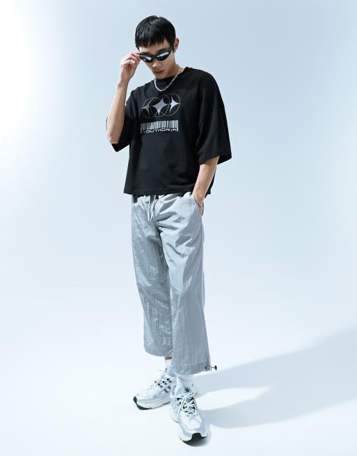 ASOS DESIGN wide awkward length nylon trouser with toggle detail in silver