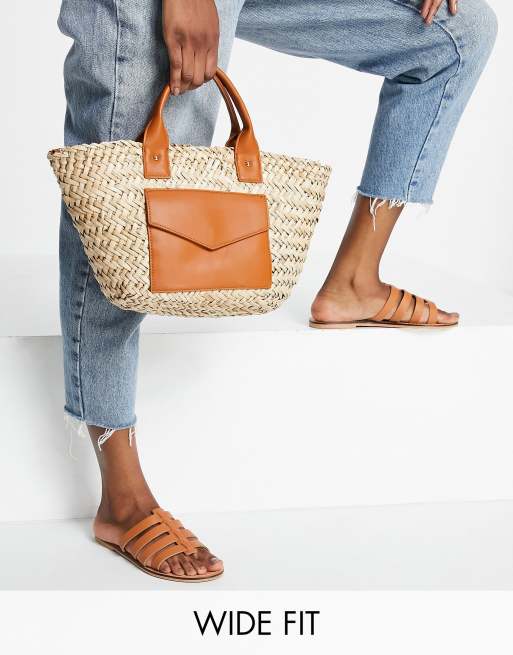 ASOS DESIGN Wide Fit Figured leather fisherman mules in tan