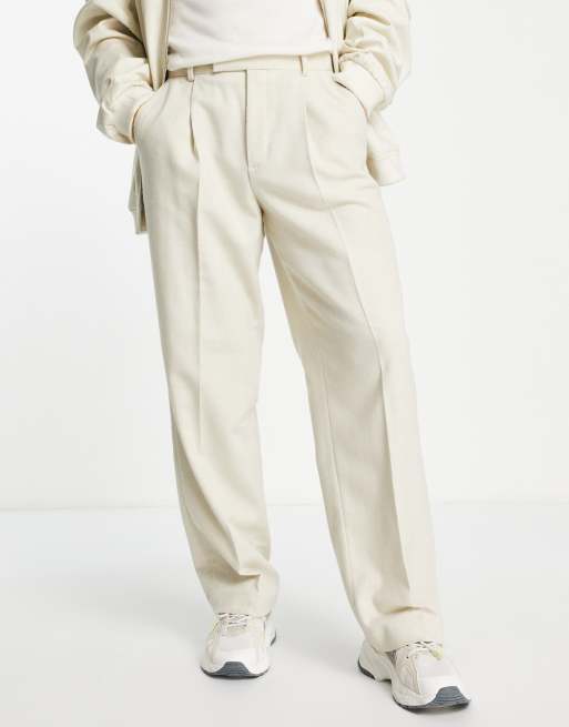 ASOS DESIGN wide wool mix herringbone smart trousers in ecru
