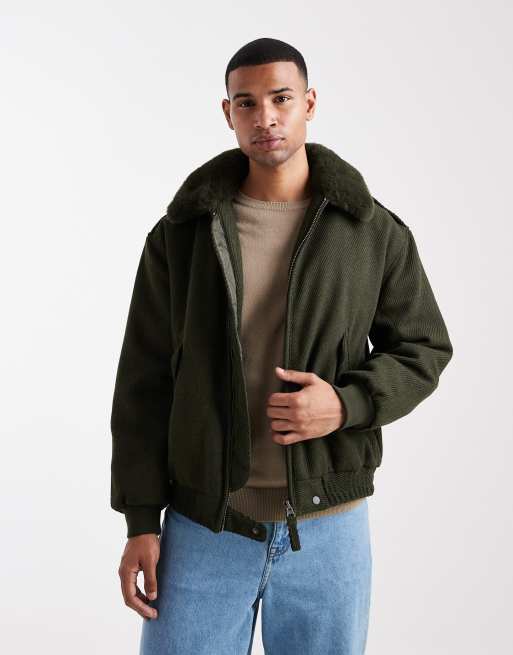 ASOS DESIGN wool look bomber jacket with faux fur collar in dark green