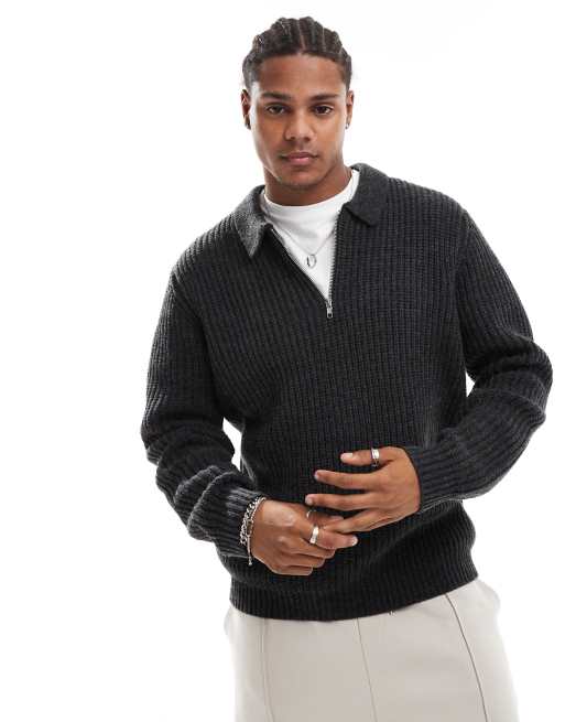 ASOS DESIGN wool mix oversized heavyweight quarter zip rib knitted polo in charcoal