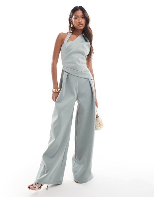 ASOS DESIGN wrap around halter neck jumpsuit in sage green in scuba-style fabric