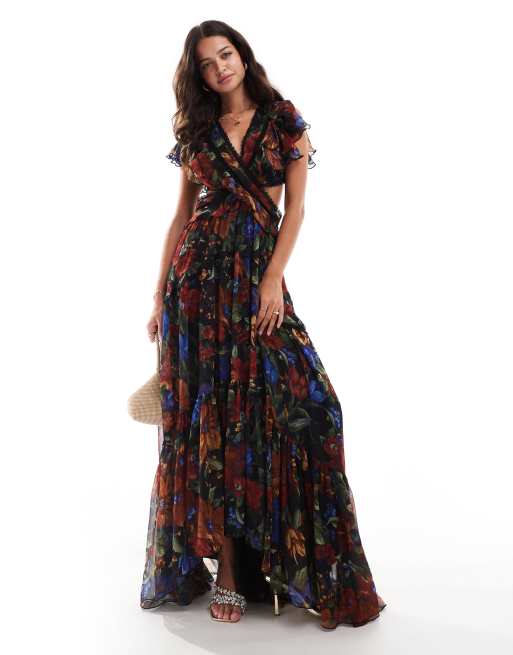 ASOS DESIGN wrap flutter sleeve maxi dress with lace trim in black floral print
