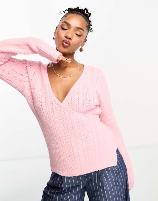 ASOS DESIGN wrap jumper with cable stitch in pink