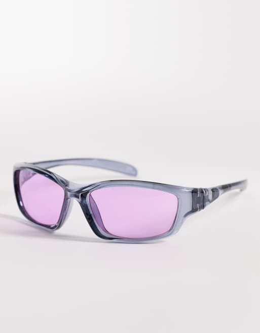 ASOS DESIGN wrap sunglasses in crystal blue frame with purple lens