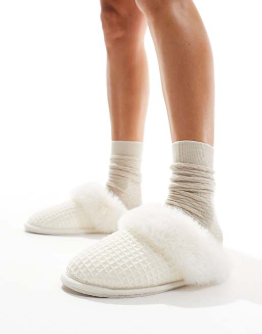 ASOS DESIGN Zaria waffle detail mule slippers in cream