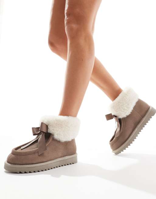 ASOS DESIGN Zeppy bow detail premium suede bootie slippers in taupe
