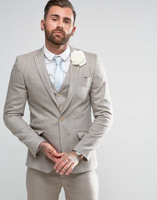 ASOS Wedding Skinny Suit Jacket In Herringbone Stone Wool Blend