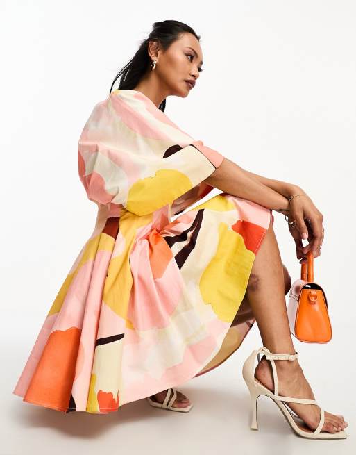ASOS DESIGN v neck short sleeve structured mini dress in bold pink graphic print