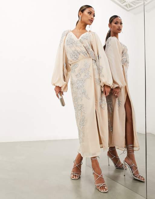 ASOS EDITION crystal floral embellished midi wrap dress in blush
