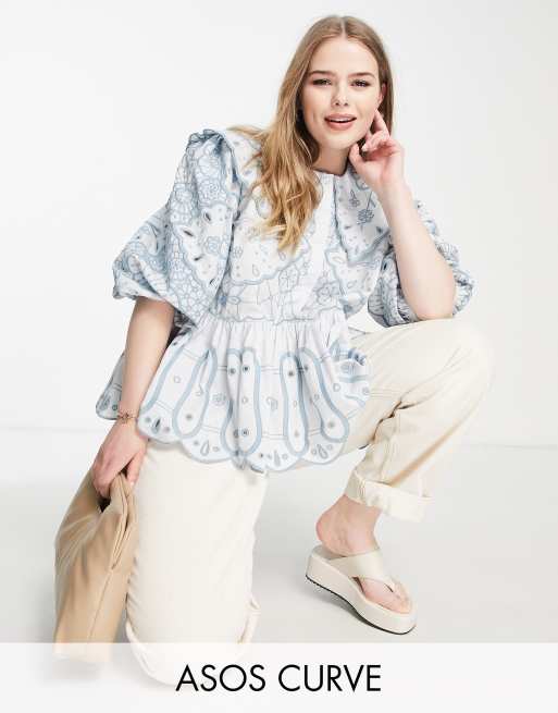 ASOS EDITION Curve cutwork broderie smock top with tonal embroidery in blue