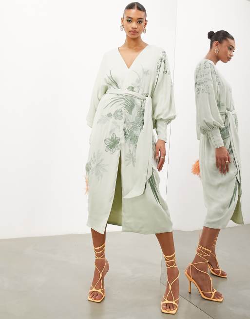 ASOS EDITION embroidered satin belted v neck midi dress in sage green