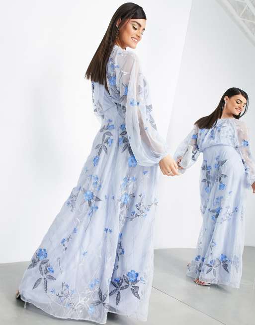 ASOS EDITION floral and leaf embroidered mesh maxi dress in pale blue