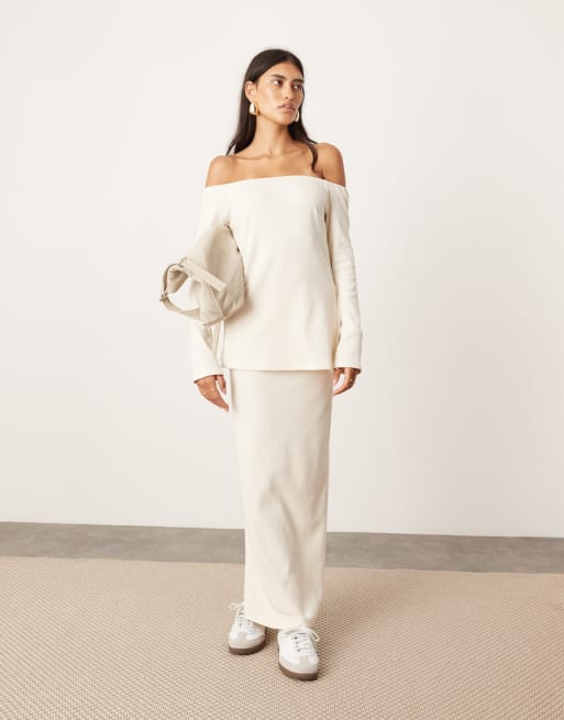 ASOS EDITION jersey bardot longline top with split hem and maxi skirt in cream