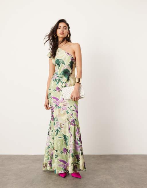 ASOS EDITION one shoulder seam detail maxi dress with full skirt in green floral print