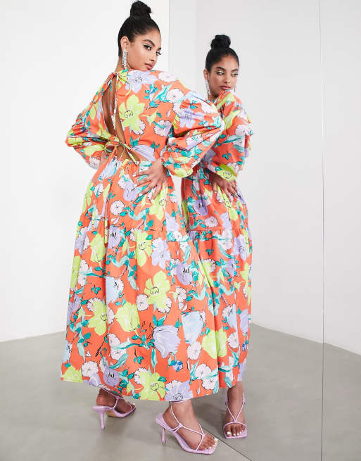 ASOS EDITION oversized smock midi dress with cut out back in orange floral print