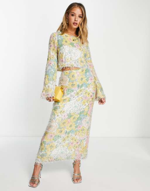ASOS EDITION pastel floral print and sequin midi skirt with fringe