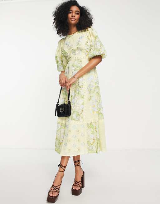 ASOS EDITION printed embroidered midi dress with lace inserts and tie back in yellow