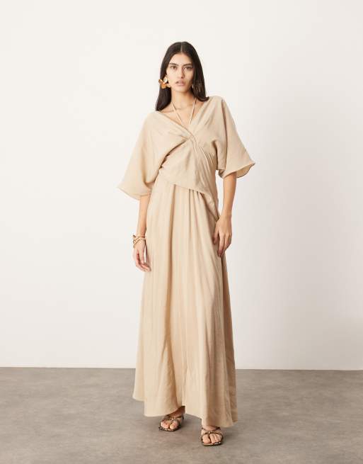 ASOS EDITION short sleeve v neck tie detail maxi dress in stone