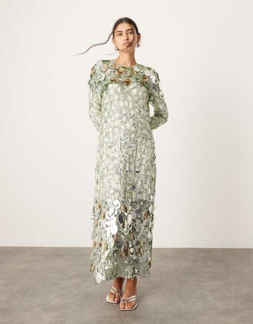 ASOS EDITION stacked multi sequin long sleeve column midaxi dress in green