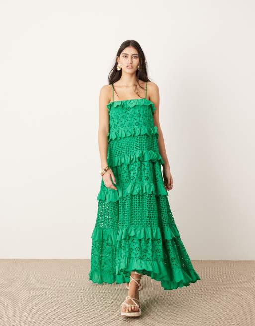 ASOS EDITION strappy broderie trapeze tiered maxi dress in mid green
