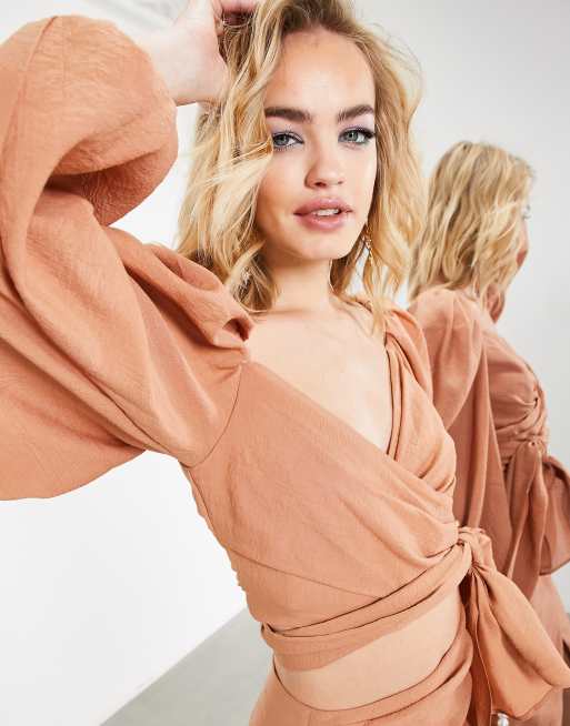 ASOS EDITION wrap front crop top with open back and tie in caramel