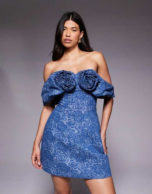 ASOS LUXE bandeau corsage off the shoulder dress in floral denim