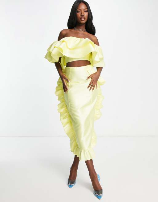 ASOS LUXE co-ord satin ruffle pencil midi skirt in lemon