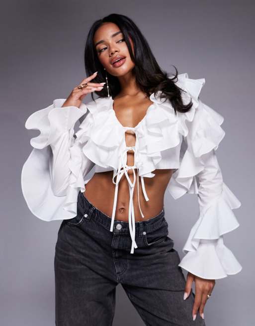 ASOS LUXE cotton poplin exaggerated ruffle blouse in white