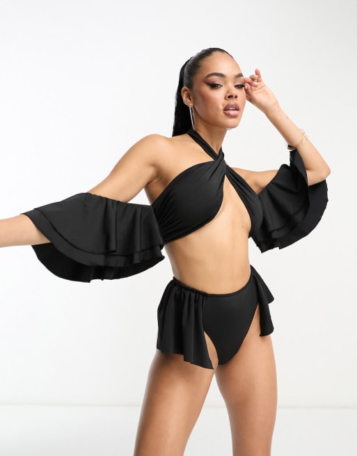 ASOS LUXE cross neck ruffle sleeve bikini top and high wasit bikini bottoms in b