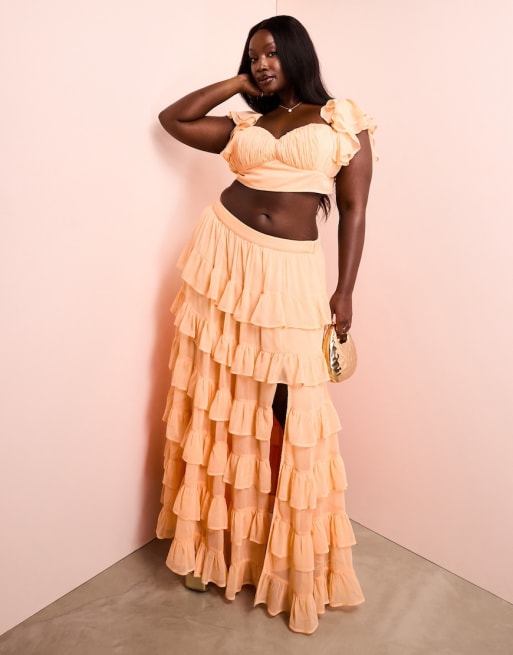 ASOS LUXE Curve beach co-ord tiered sheer maxi skirt and top in apricot