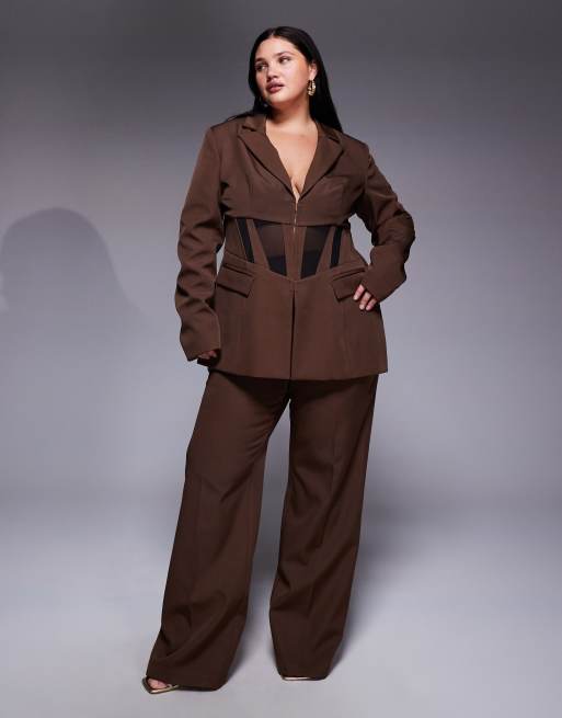 ASOS LUXE Curve co-ord cinched waist blazer with contrast panelling and straight trousers in brown