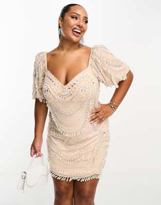 ASOS LUXE Curve encrusted mini dress with puff sleeve and faux pearl embellishment