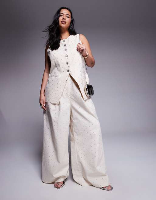 ASOS LUXE Curve hot fix linen waistcoat with embellished buttons and wide leg trouser in stone