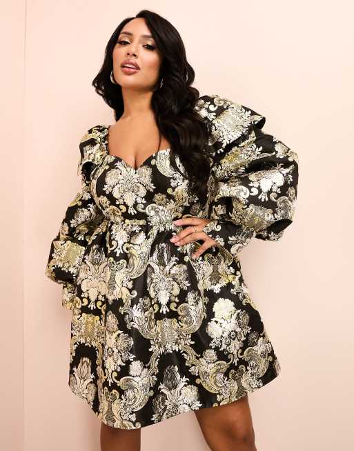 ASOS LUXE Curve jacquard baby doll mini dress with puff sleeves in black and gold
