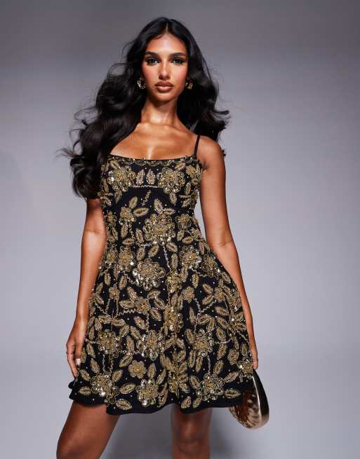 ASOS LUXE floral embellished cage skirt mini dress in black