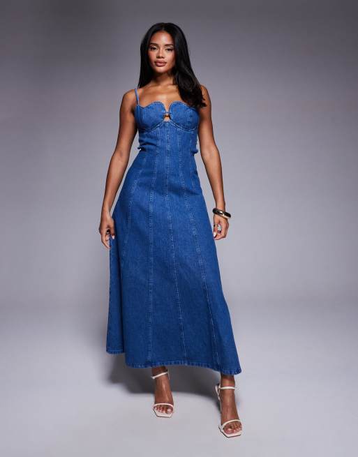 ASOS LUXE heart cup denim maxi dress in midwash blue