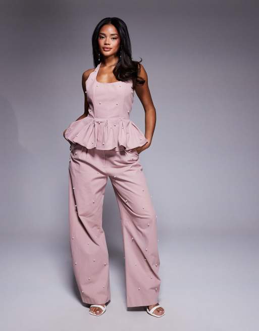 ASOS LUXE pearl embellished cotton twill corset peplum top and twill barrel trouser co-ord in pink