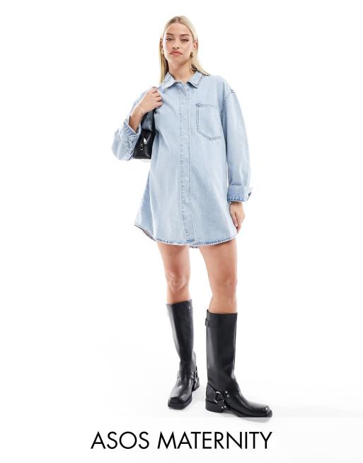ASOS DESIGN Maternity denim mini shirt dress with front pockets in bleach wash