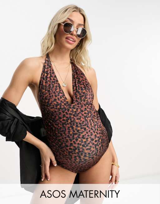 ASOS DESIGN Maternity exclusive halter plunge swimsuit in tortoise shell print
