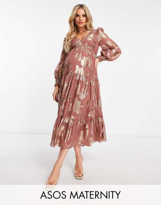 ASOS DESIGN Maternity metallic channel detail midi dress with puff sleeves and tie back detail in rust