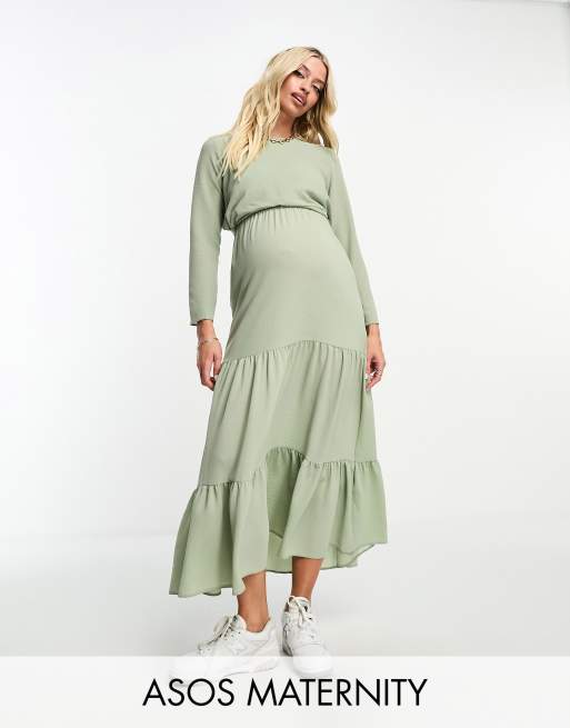 ASOS DESIGN Maternity nursing drawstring waist tiered midi dress in sage